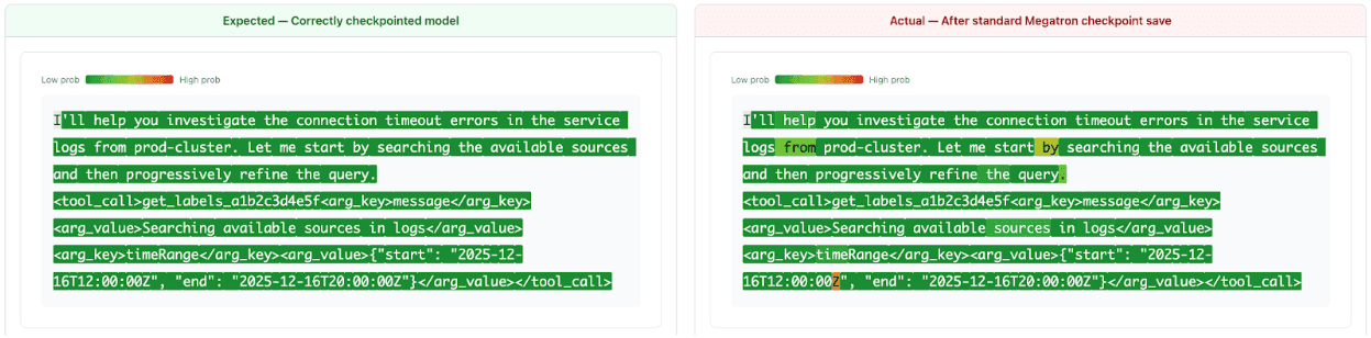 | Expected output from a correctly checkpointed model with uniform high confidence across all tokens. | Actual output after loading from checkpoint with scattered low-confidence tokens on words the model had perfectly memorized during training |